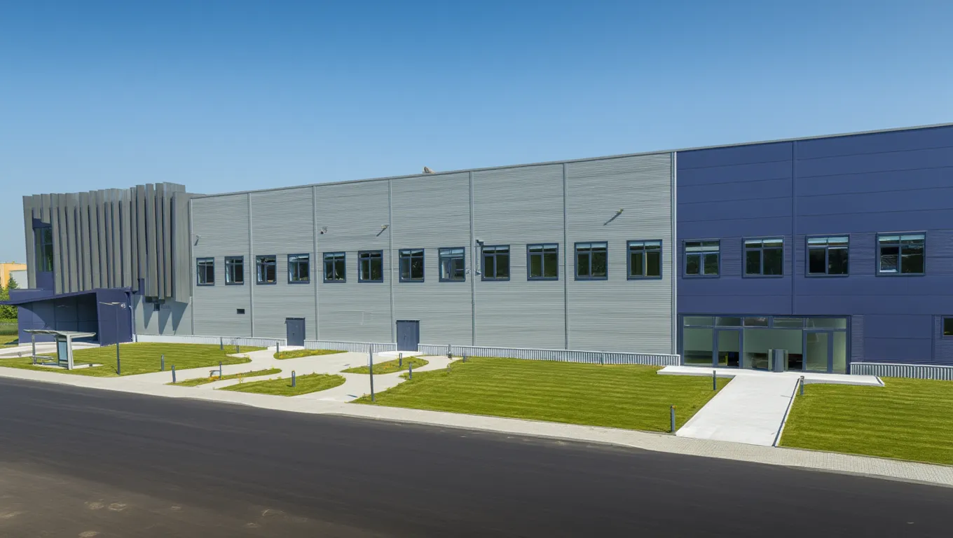 Фасад выполнен в лаконичном индустриальном стиле с использованием сэндвич‑панелей и больших остеклённых участков. Такое решение не только придаёт сооружению современный облик, но и обеспечивает достаточное естественное освещение рабочих зон.