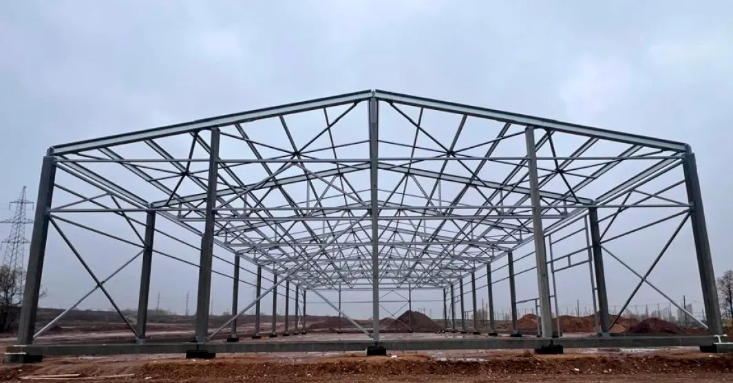 Основу здания составляет прочный металлический каркас из профильных труб с антикоррозийным покрытием. Он рассчитан на высокие снеговые и ветровые нагрузки, что гарантирует устойчивость и долговечность конструкции. Каркас обшивается трёхслойными сэндвич‑панелями с утеплителем — это обеспечивает хорошую теплоизоляцию и снижает эксплуатационные расходы на отопление и кондиционирование.